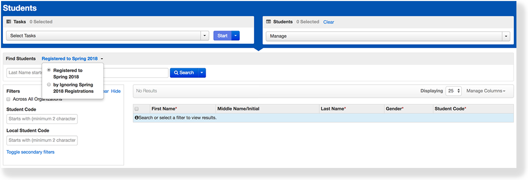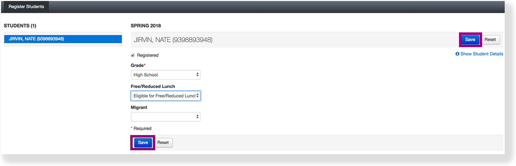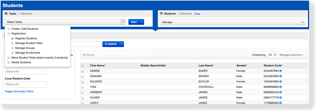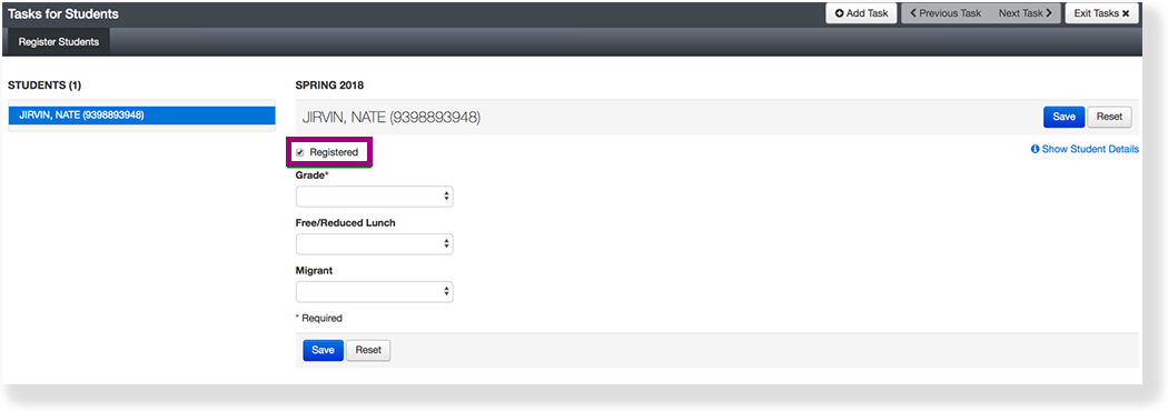 Pearson recommends that you register a student at the same time that you Create a Student Record. If the student record was previously created, you must select by Ignoring to find unregistered student records.