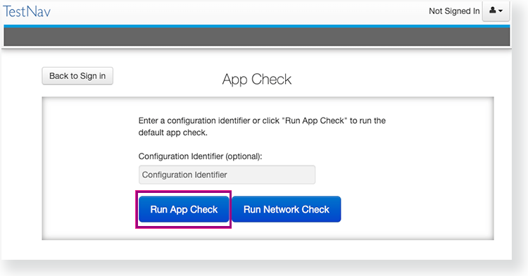 Additional step for PearsonAccessNext installations only (not ADAM): If you have obtained a Configuration Identifier from your assessment management system, enter it in theConfiguration Identifierfield on the App Check page.