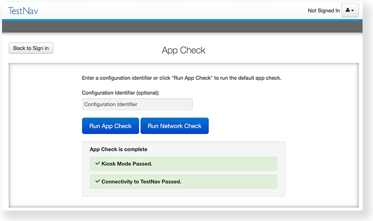 When the app check completes, review the results. Green checkboxes for Kiosk Mode readiness and connectivity to TestNav display if the system passes. If one of these fails, a message indicates you must check your connection and settings before running App Check again. .