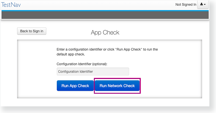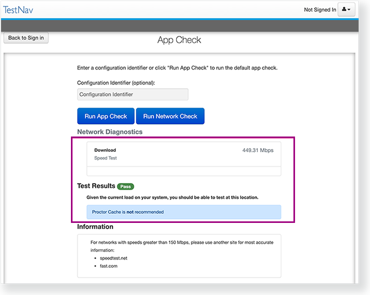 The configuration identifier allows TestNav to also check connection to ProctorCache computers. If your assessment management system allows, this configuration ID may also check for blocklist compliance. If ProctorCache connectivity (or blocklist compliance) fail, TestNav provides information for possible resolutions.