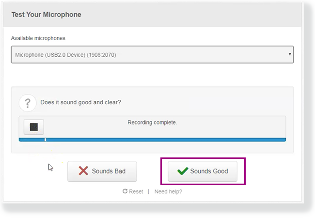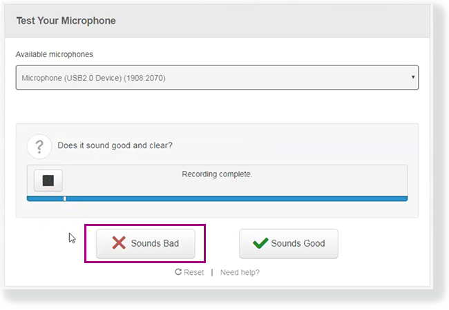 - Click Sounds Bad > Reset to start microphone selection and test again.