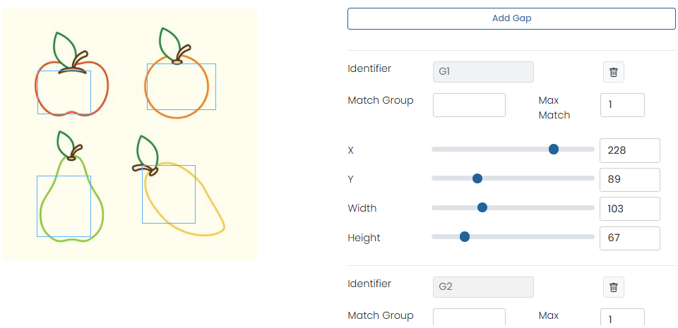 - Add and delete the number of gaps as needed for the item. Add gaps by selecting Add Gap and delete gaps by selecting the trash can icon. Use the X, Y, Width and Height to position the area where the student should click for each gap.