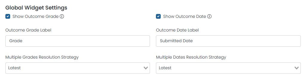 This feature allows for customization of the labels that appear across all widgets instead of using one set of "Grade" and "Submitted Date" labels on all ISR versions. Users can override the labels (ex. translations for languages by version) using the Outcome Grade Label and Outcome Date Label fields. Additionally, apply logic to which grade and date appears when there are multiple available.