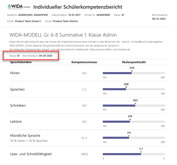 • Score and Performance: Shows the scaled score and a bar with colors for each performance level. Select the checkboxes to show test information, score group summary statements, and school and district averages. Supports ADAM data only.