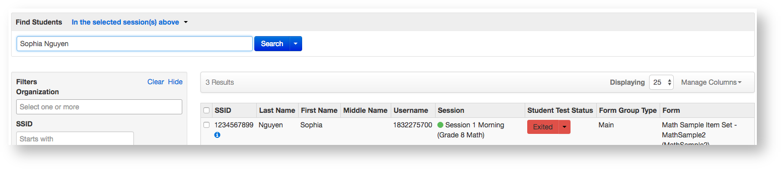 4. Search to find the student whose status you want to view. You can change the Find Students setting to show only students in your currently selected session or in all available sessions.