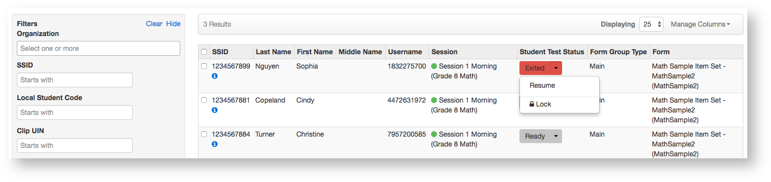 5. Resume the student's test by clicking the arrow next to the student's status, and selecting either Resume or Resume Upload*.