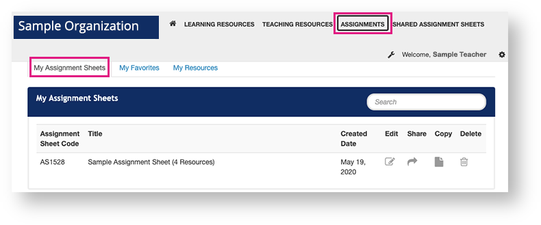 4. Click Assignments from the primary navigation, and the copied sheet appears under My Assignment Sheets.