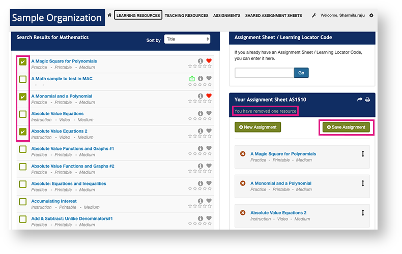 2. Select the resource(s) you want to add or remove, and then click Save Assignment