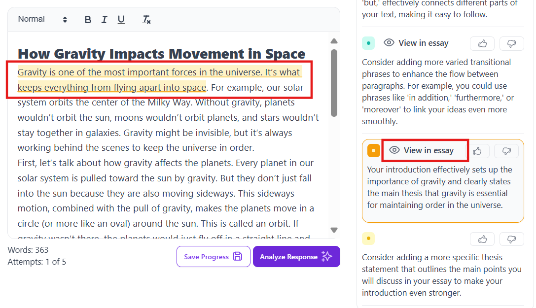 The student should be encouraged to make improvements to the response based on the feedback and select Analyze Response again to see revised feedback on their changes.
